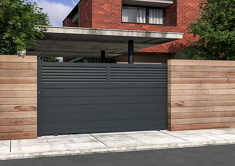 Portail à lames ventilées et lames horizontales de 200mm. Accessoires fournis. Assemblage mécanique , prêt à poser. Renfort intégré pour motorisation.